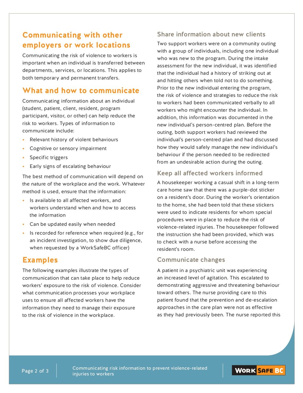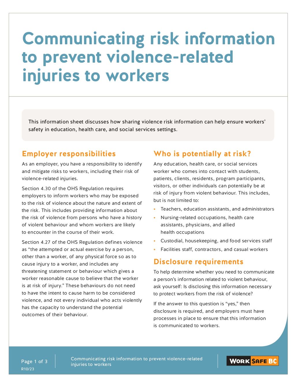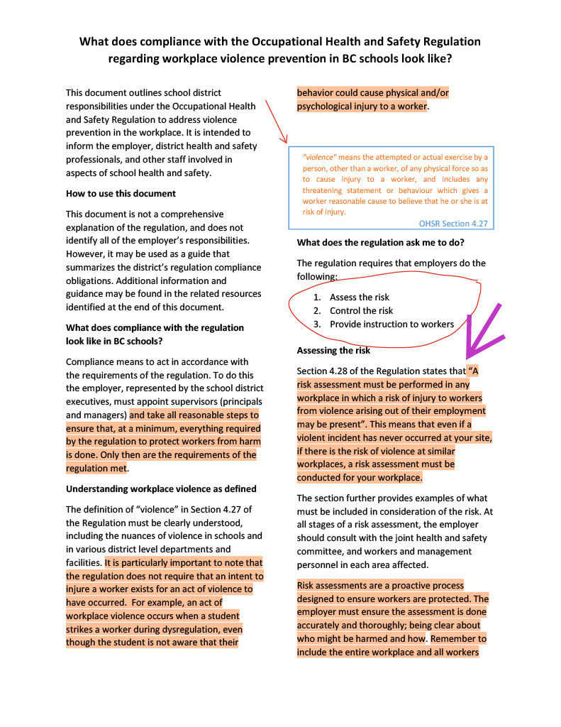 There is ONE main problem with the below resource - it mentions "baseline" behaviour as not qualifying as violence -- this does NOT align with the laws. WorkSafe BC does not mention baseline as a criteria.